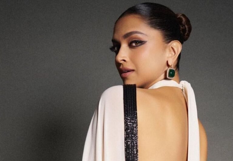 The high-neck halter-style blouse complements Deepika’s appearance, elongating her neck, while the backless design adds a touch of allure to the saree. The sharp draping by Dolly Shah accentuates Deepika’s frame and elevates the overall look as the pallu cascades gracefully over her shoulders. For her makeup, artist Anil Chinappa gives her a radiant base with highlighter on her cheeks and subtle contouring to define her jawline. He takes a slightly dramatic approach with her eyes, heavily lining them with kohl and creating a winged liner look. The sleek pulled-back bun by Yianni Tsapatori completes the ensemble. Deepika accessorizes with square emerald earrings set with diamonds, adding a hint of color to the monochrome look and drawing attention to the high-necked blouse.