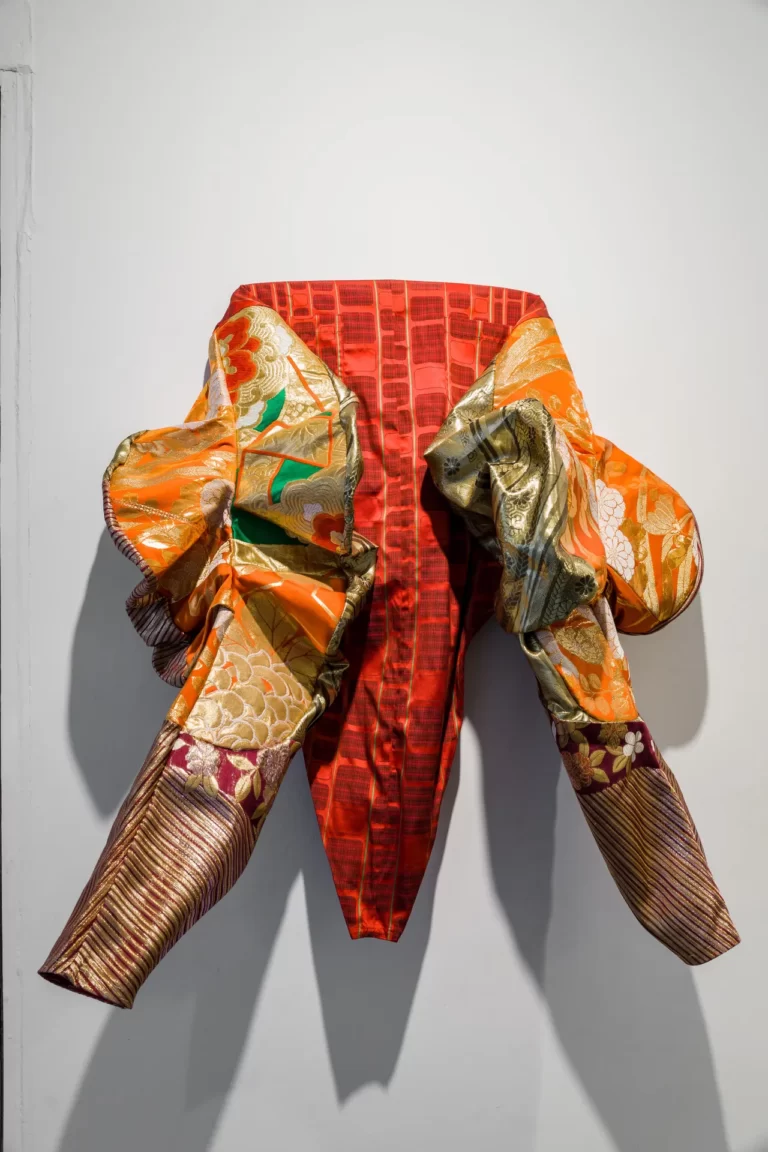 Haoris traditionally worn by men have been shaped into hyper-feminine, amorphous forms. What appear to be decorative elements are present in the exhibited clothing as agents to the textile’s behavioural changes.